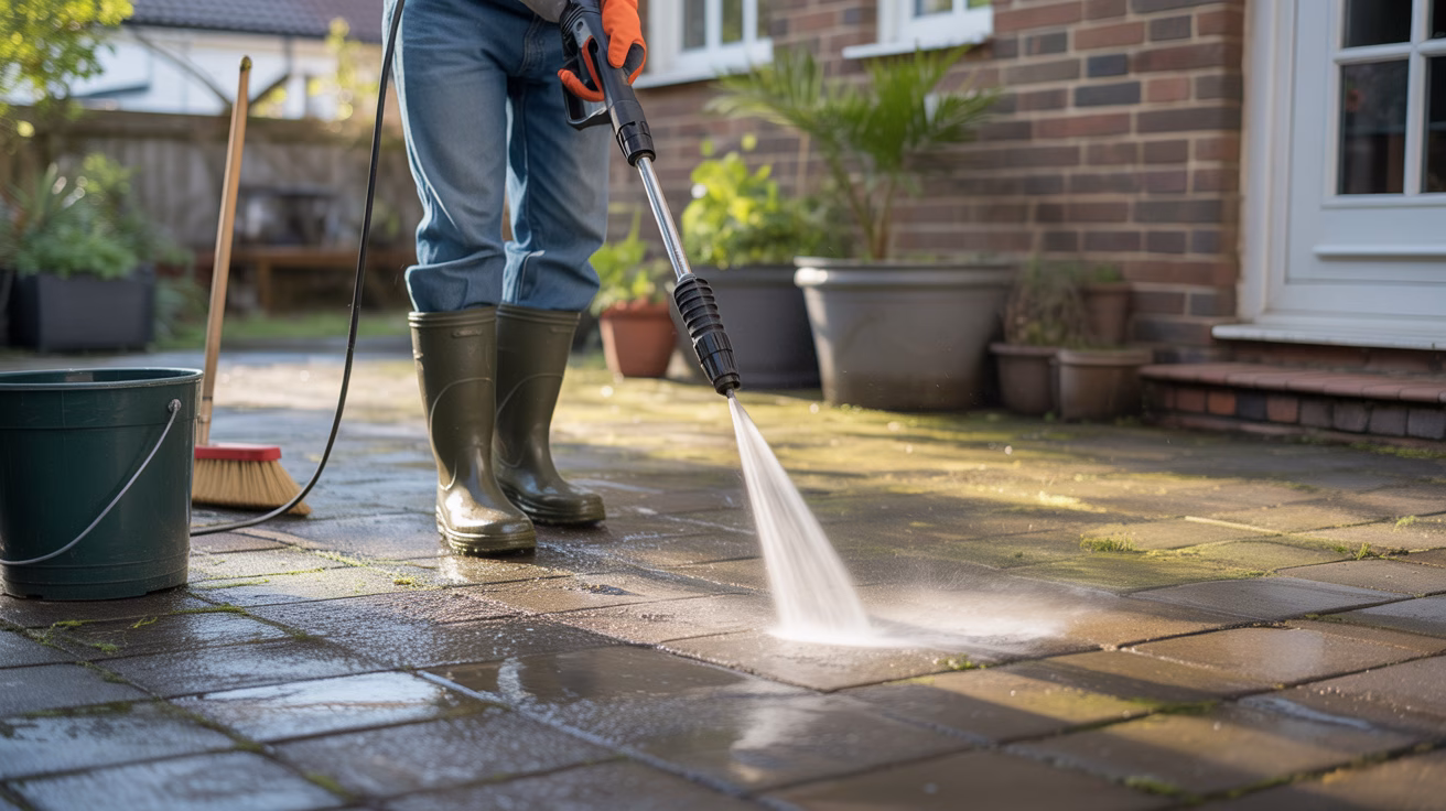 - Jeśli posiadasz myjkę ciśnieniową, użyj jej na końcu: ciśnienie 100–150 bar jest zwykle wystarczające dla domowych zastosowań, ale trzeba uważać, aby nie uszkodzić fug i krawędzi kostki. Gorąca woda (60–80°C) zwiększa skuteczność w połączeniu ze środkiem odtłuszczającym.