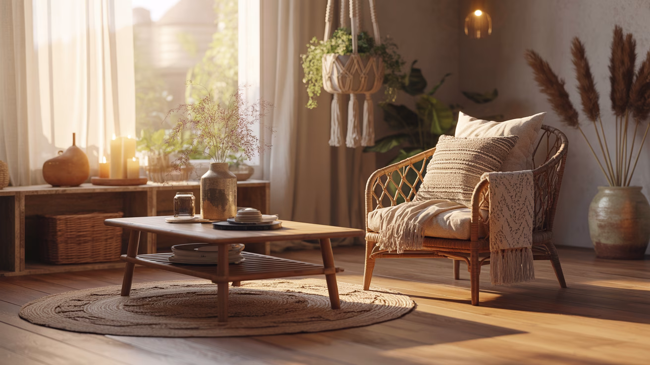 Klucz do autentycznego efektu leży w harmonii kolorystycznej. W styl boho dominują barwy ziemi: różne odcienie beżu, ciepłe brązy, rdzawe tonacje oraz zielenie nawiązujące do natury. Takie zestawienie wprowadza spokój i pozwala roślinom stać się centralnym elementem kompozycji. Z praktycznego punktu widzenia warto stosować paletę o niskim kontraście — tła w odcieniach kremu i piasku, meble w naturalnym drewnie oraz akcenty zieleni w formie roślin doniczkowych i tekstyliów.